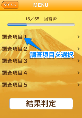 | 数多い調査項目(全55問)をフリックで次々と選択が可能 |